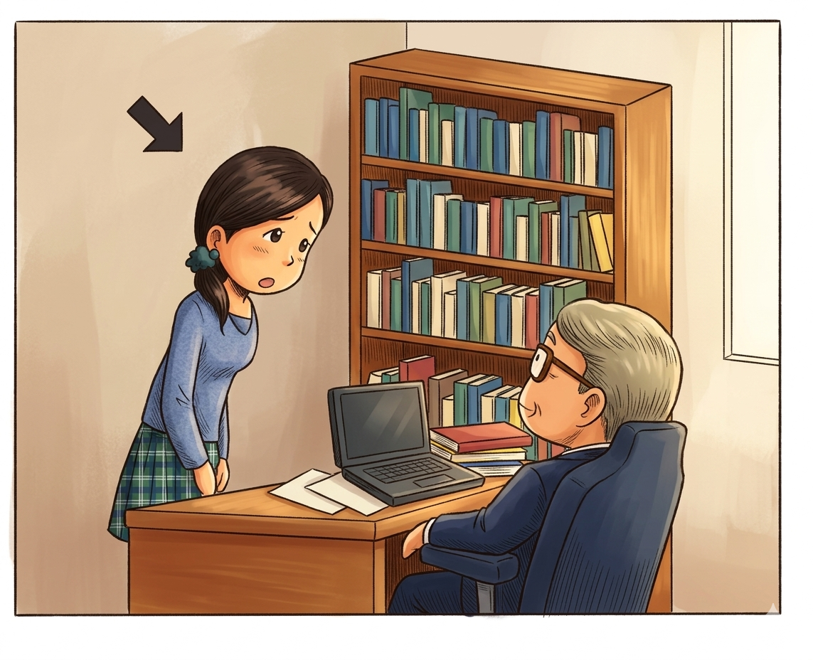 4 けんきゅうしつで 先生せんせいに ちょくせつ わたす。