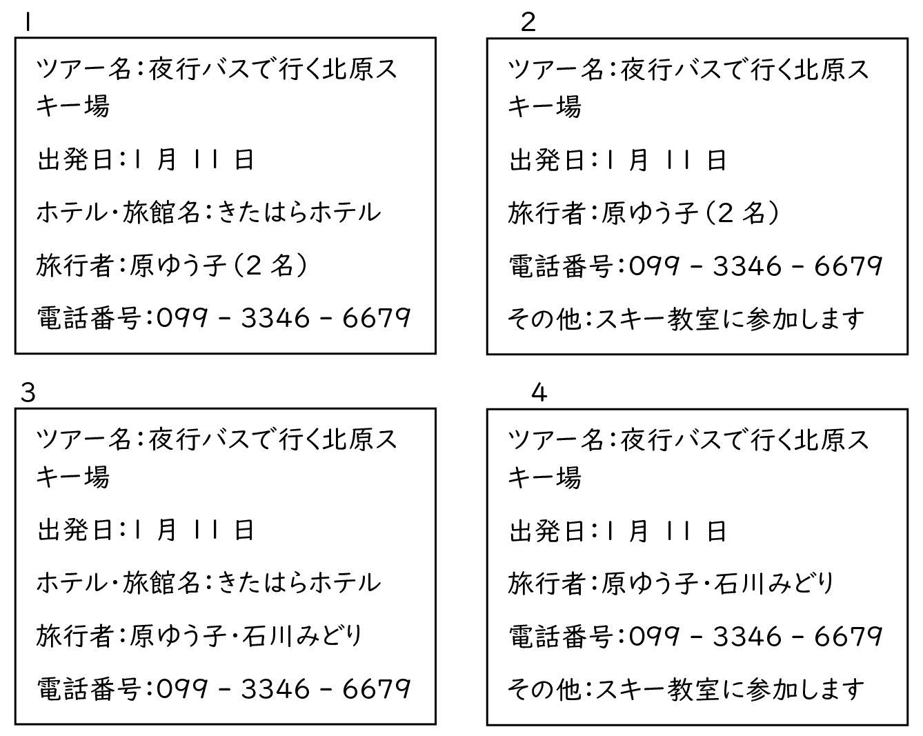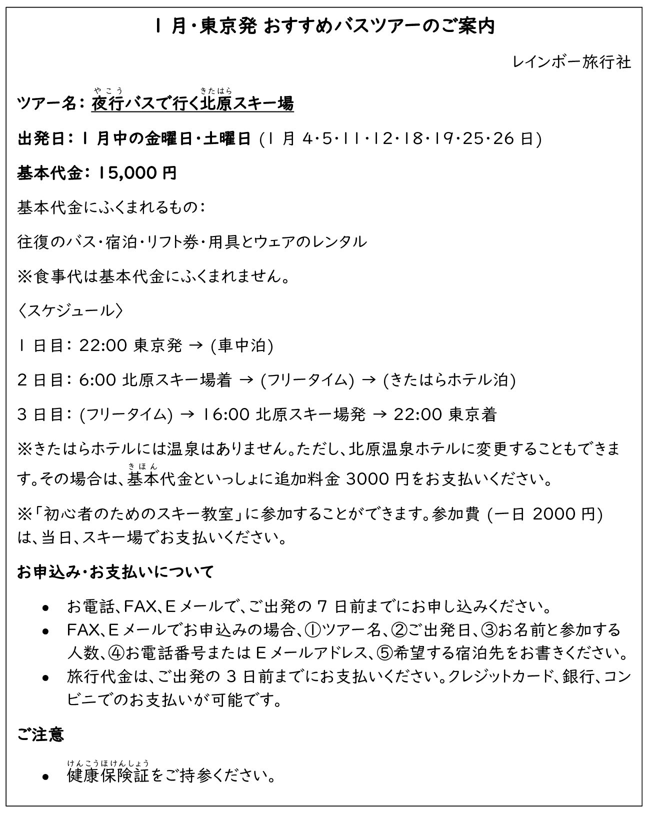 原さんは友達の石川さんと、メールでこのツアーに申し込む。きたはらホテルに泊まり、スキー教室にも参加したいと思っている。申し込みの内容が正しいのはどれか。