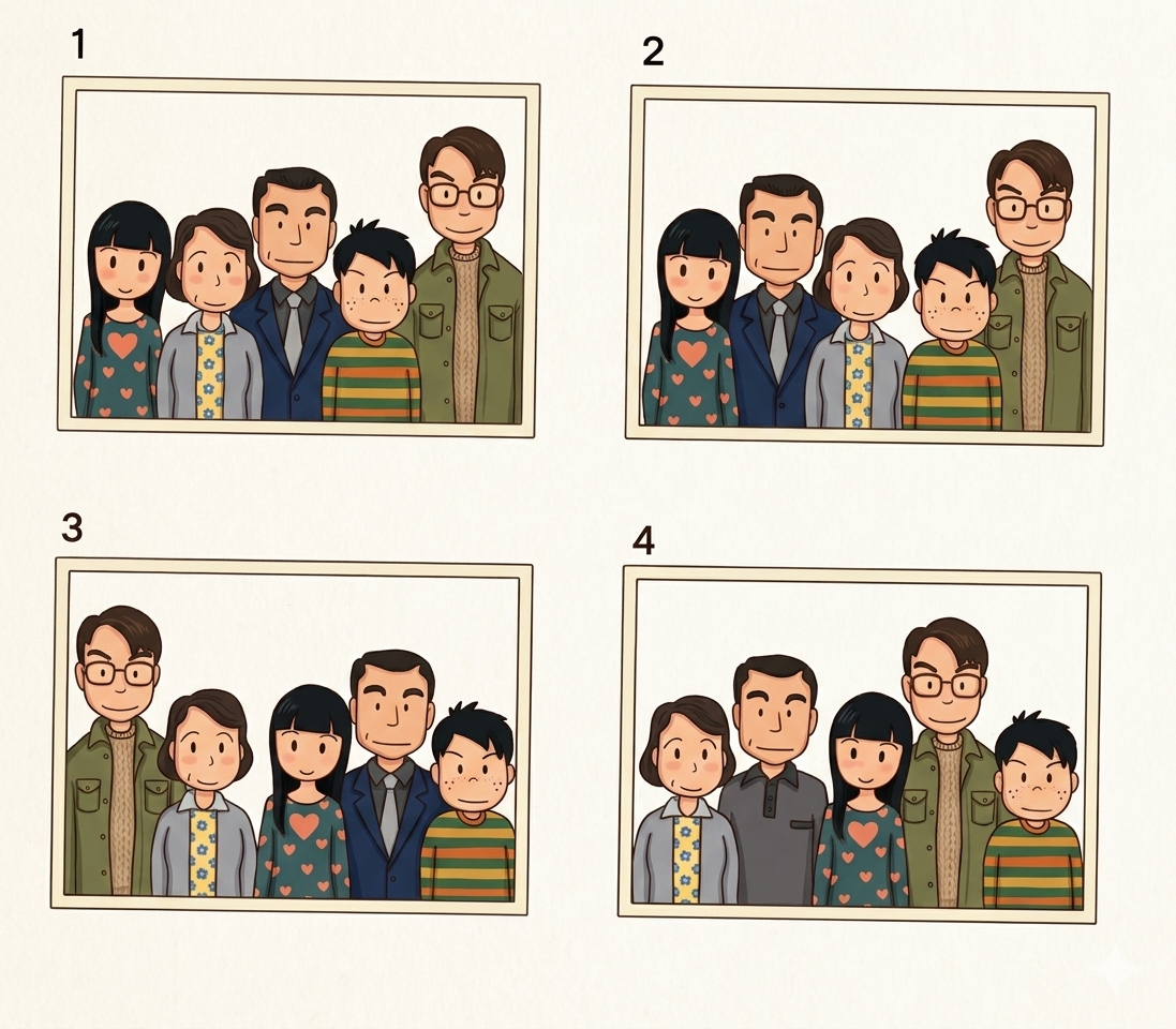 この しゃしんの いちばん みぎに いる ひとは わたしの あにです。あにの となりに おとうとが います。わたしの となりにには ははが います。ははの となりに いる ひとが ちちです。