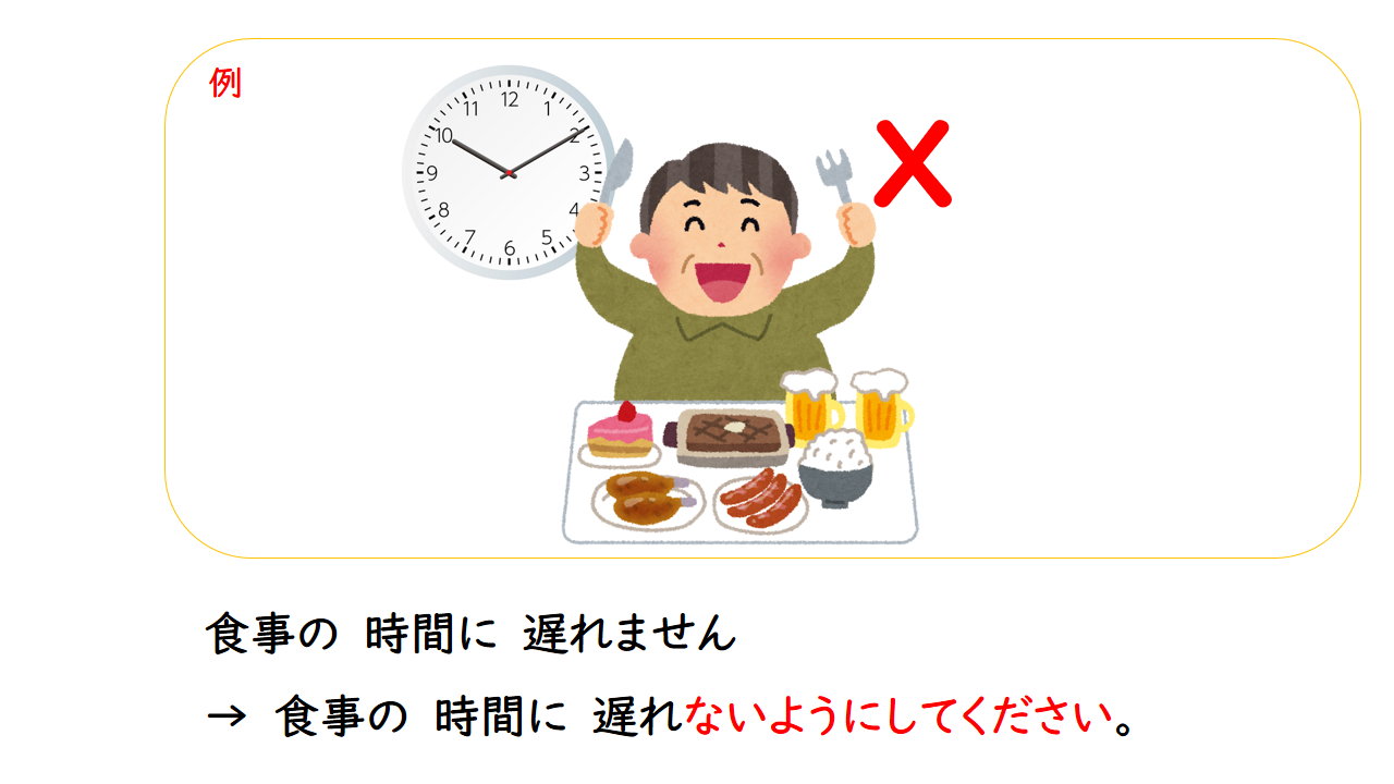 – Chú ý: không dùng Ⅴるようにしてください trong trường hợp sai khiến, nhờ vả việc được thực hiện ngay tại chỗ.