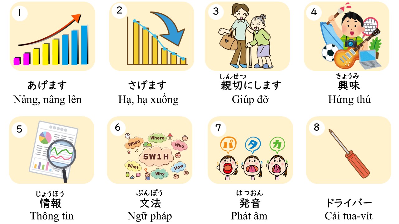 あげます | 上げます | THƯỢNG | Nâng, nâng lên, tăng lên |