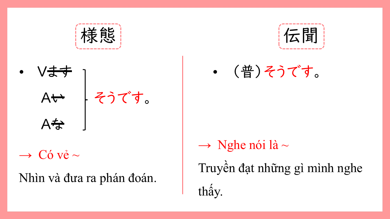 – Khi muốn thể hiện ý phủ định hay quá khứ với mẫu câu này, phần 「そうです」không thay đổi, chỉ thay đổi thì của các động từ, danh từ, tính từ đi trước nó mà thôi.