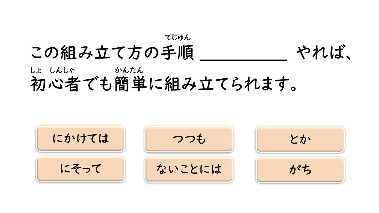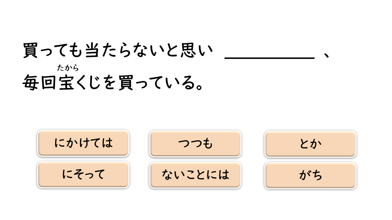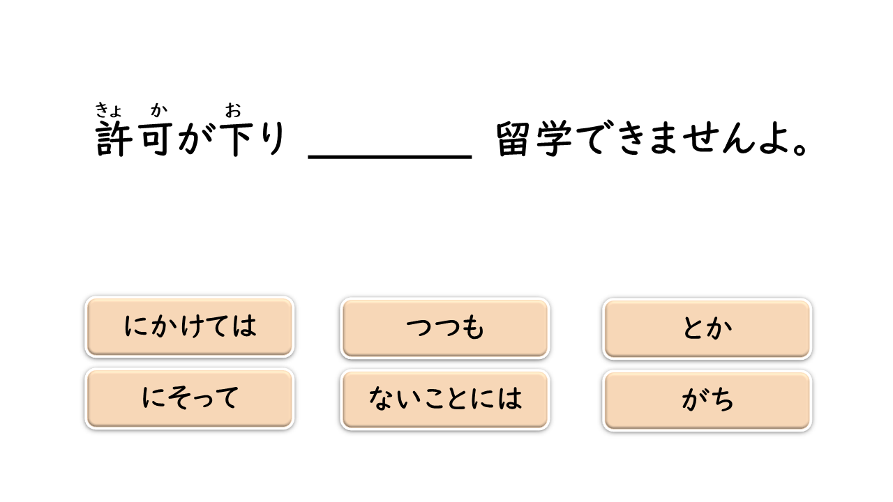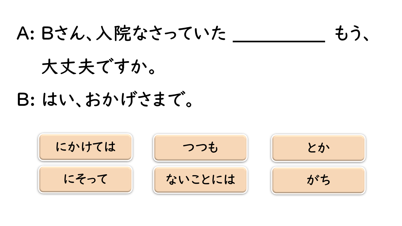 PI +とか Nghe nói con trai anh/chị sắp kết hôn. Xin chúc mừng ạ. ~にそって Hai người tiếp tục đi bộ trên con đường lúc chạng vạng, men theo bờ sông. N + にかけては Cậu Ito vừa đứng đầu lớp về học tập, mà về chạy bộ cũng là số một trong lớp. V Ở vùng quê, nếu không có ô tô thì không thể sống được. がち Những chuyện không vui thì quên đi là tốt nhất đấy. V Dù nghĩ là hôm nay nhất định phải đi nha sĩ, nhưng vì bận nên cuối cùng vẫn không đi được.ない + ないことには ます +つつも