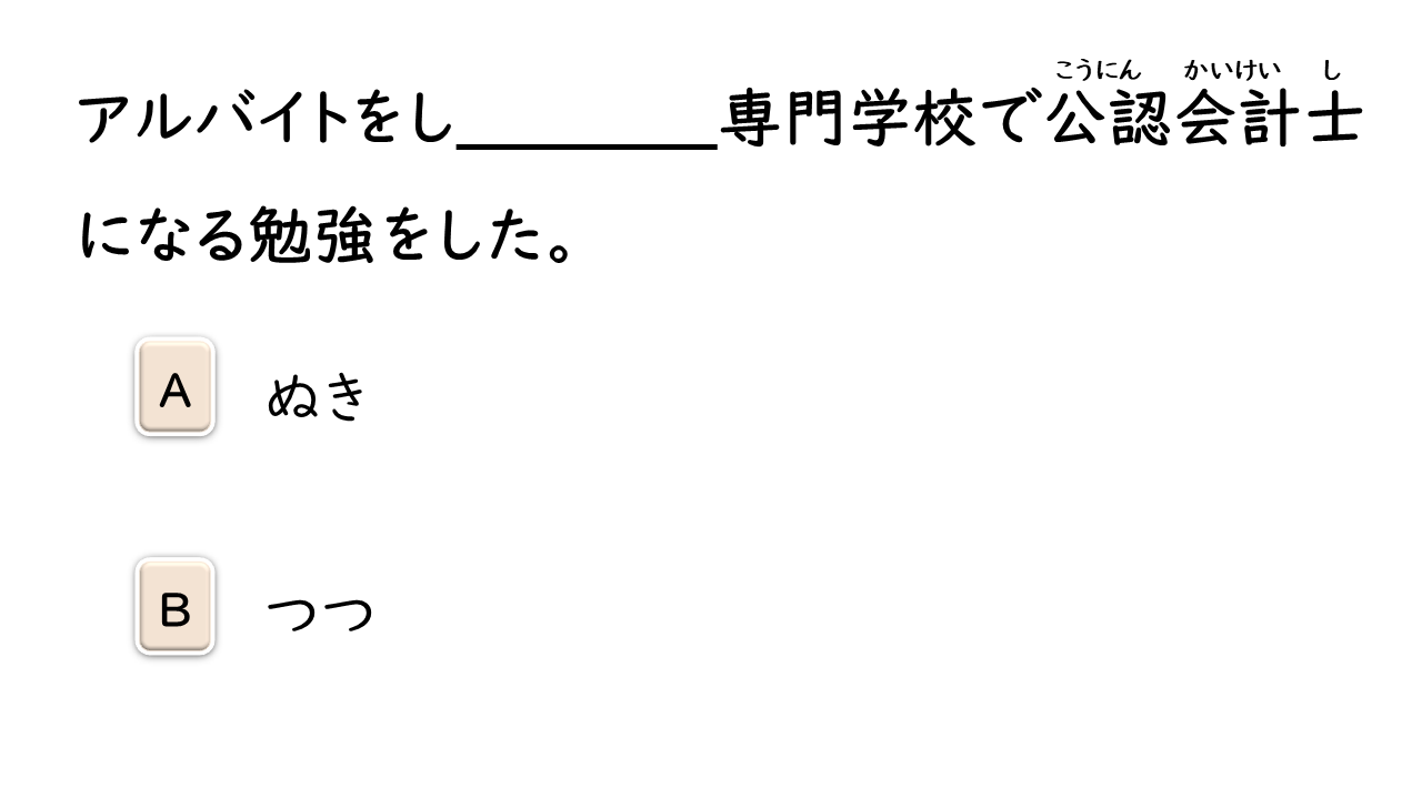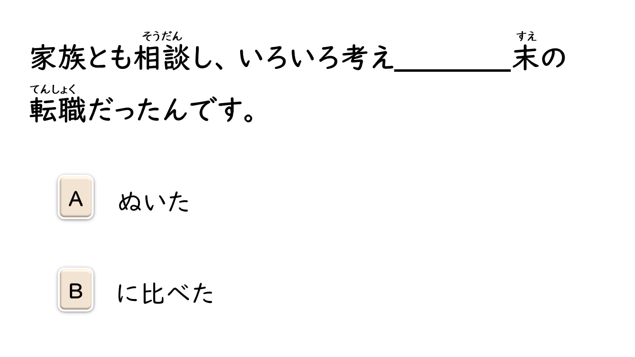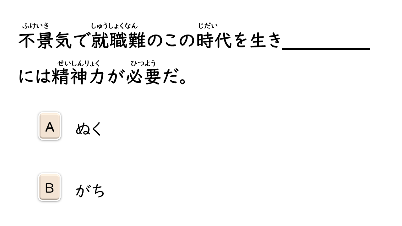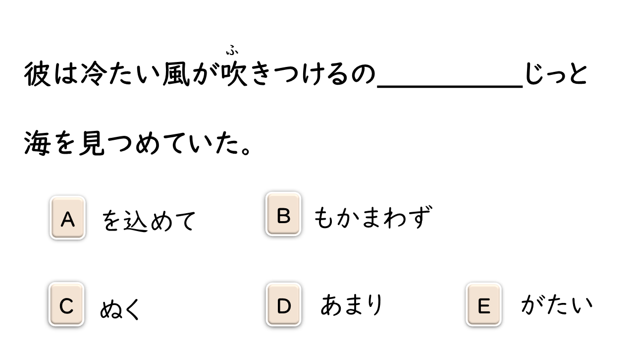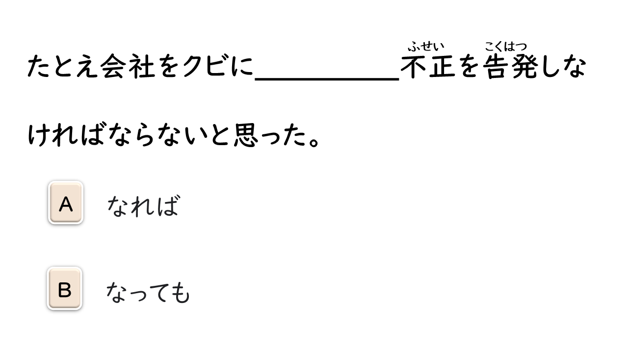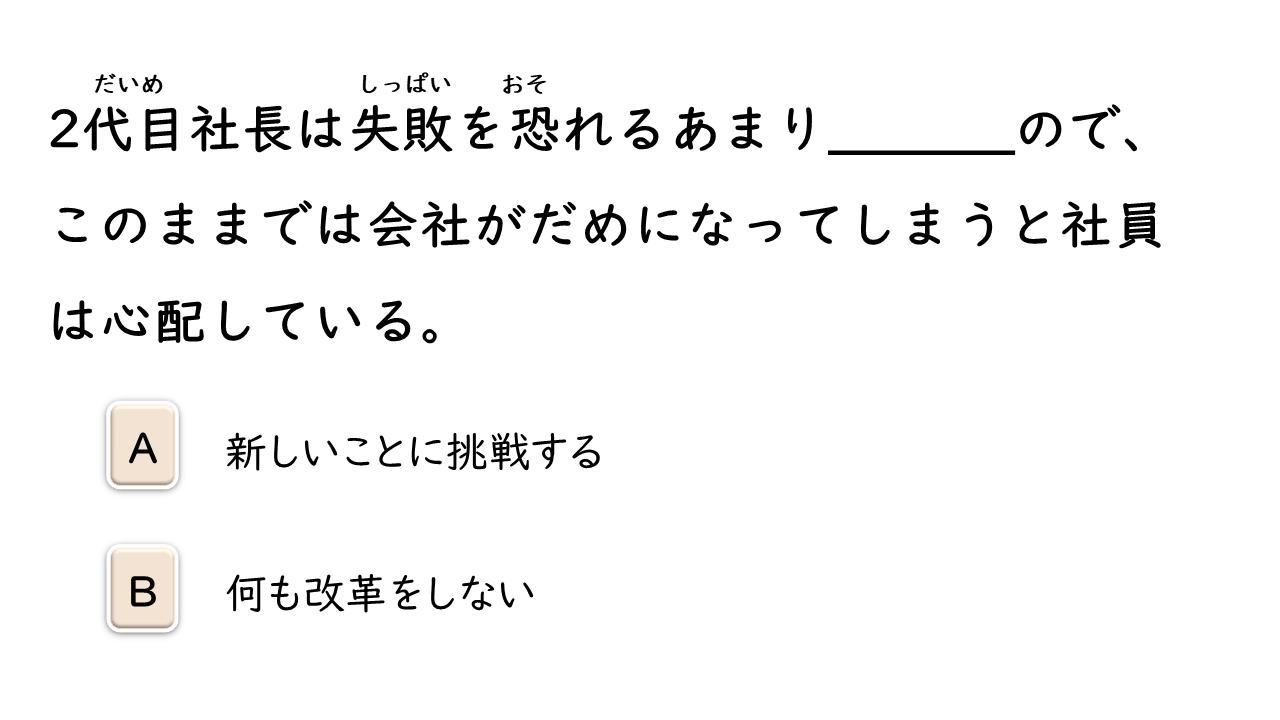 暴力を振るう 勇気を出す 突き当り 漏れる 叫ぶ 腹 パンチ 眩しい 問いかける 戸惑う 自主制作 主役 荷物運び 友情 困難(な) チョモランマ 山頂 治療費 お世辞 合併(する) 申し出 命令(する) 逆らう 脱サラ(する):「脱サラリーマン」の略。独立してビジネスを始めること。 安定(する) 記録 薬物 フィアプレイ 精神 反する 行為 方針 歩道 うらやましい 感情 否定(する) 履歴書 職歴 欄 人目 抱き上げる 虫に刺される 食欲 (家族を)亡くす 閉じこもる 衝撃的な 映像 結婚記念日 解答欄 2代目社長 恐れる 挑戦(する) 改革(する) 親しみを込める ニックネーム ダイヤモンド 千羽鶴 恨む にらみつける 食べ放題 肌寒い 福利厚生 出場(する) 受け継ぐ 北国 耐える 芽 訪れる 精神力 公認会計士 事態 確信(する)