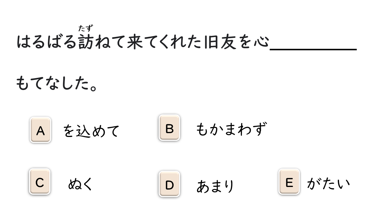 たとえ〜ても Dù có xa cách đến đâu, tôi cũng sẽ không bao giờ quên tình bạn của bạn. V- Với những điều kiện này, thật khó có thể chấp nhận lời đề nghị sáp nhập từ công ty Suzuki Shoji. N + もかまわず Chúng tôi ngày nào cũng chơi trong rừng, dù bị côn trùng đốt cũng không để ý. あまり Bị giẫm lên chân trong tàu điện, vì quá đau nên tôi không thốt ra được tiếng nào. N + を込めて Các bạn cùng lớp gọi nhau bằng biệt danh với sự thân mật. 〜もあれば〜も / 〜も〜ば〜も Cuộc đời dài lắm, có lúc tốt thì cũng có lúc xấu thôi. V- Một khi đã quyết định làm rồi thì dù có khó khăn thế nào tôi cũng quyết tâm làm cho đến cùng.ます + がたいます + ぬく