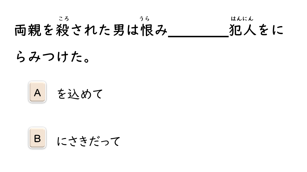| うらむ | 恨む | Hận | Ghét, hận, căm tức |