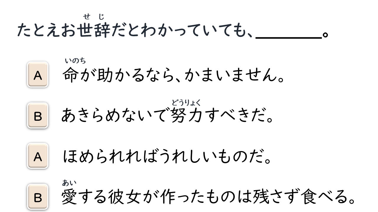 | おせじ | お世辞 | Thế Từ | Nịnh nọt, xu nịnh, tâng bốc |