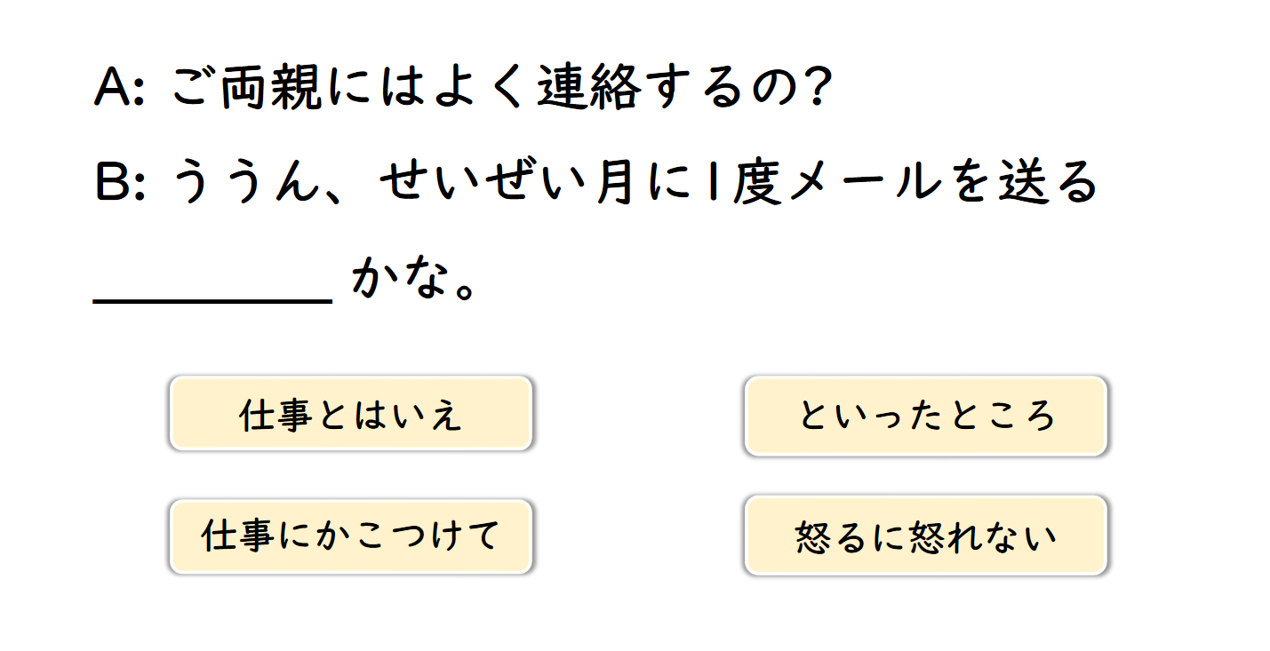 N1といわず N2といわず Bất kể ngày hay đêm, xe tải ben lớn đi qua làm nhà rung lắc, rất phiền phức. PI1 + ら PI2 + で Tiền nhà cao cũng phiền phức thật, nhưng nếu nó rẻ thì lại lo là chắc chắn có vấn đề gì đó không ổn. Vる・N にたえない Những lời lẽ toàn ngụy biện của chính trị gia đó thật chẳng đáng nghe. V-よう+ものなら Nếu lỡ bị cô ấy bắt gặp trên đường về, thì thế nào cũng bị giữ lại nói chuyện ít nhất một tiếng. PI + ならいざあしらず Nếu là người giỏi tiếng Anh như anh Katou thì còn được, chứ tôi thì làm phiên dịch trong cuộc họp là điều không thể. Cái cảnh đông nghẹt người vào giờ cao điểm này không thể cải thiện được sao nhỉ? に越したことはない Không chỉ riêng ung thư, việc phát hiện bệnh càng sớm thì càng tốt.Vない + ないものか