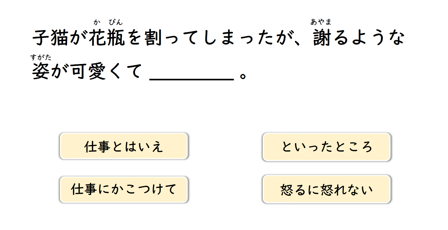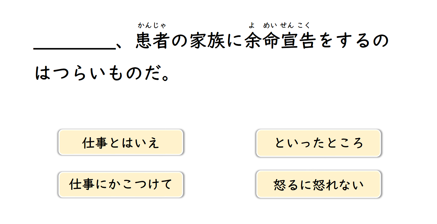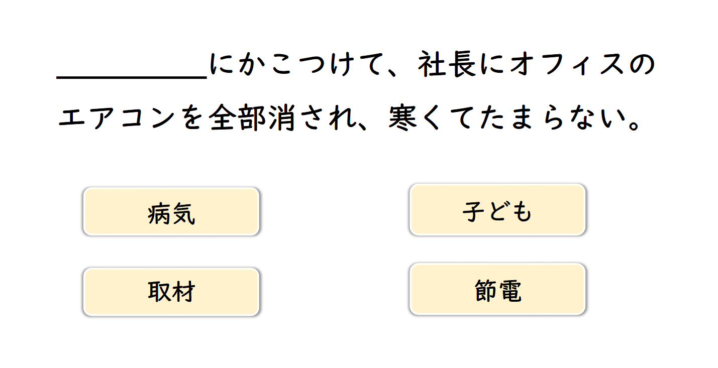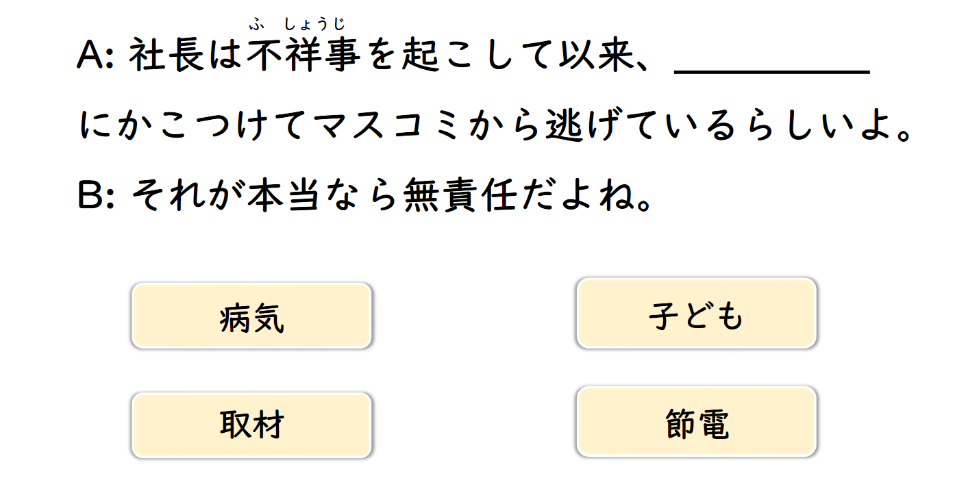 誤解(する) 国産 小型車 制服 ガードマン 早朝 深夜 怒鳴る 誠意 対応(する) マスコミ 連中 群がる 人件費 抑える 裏目に出る 信用 ~の手前 解雇 名目 廃棄処分 開発 一般 取り調べ 正体 バレる 使い道 廃棄(する) 部署 ダンプカー 揺れる 文具 グッズ 統一(する) 社交的な 先輩 後輩 誰彼なしに 床 散乱(する) 扱う 返信 運動会 ビリ 邪魔 学費 合宿 就職(する) 給料 終電 浅い 飛び込み お宅 手入れ 言い訳 低俗 表現 稚拙 人目も構わず 化粧(する) 祖母 嘆く 強行採決 国会 乱闘騒ぎ 正視 帰宅 途中 捕まる 不良品 契約 下請け 零細企業 軒並み つぶれる 言い返す 舟 提出 あっという間に 転覆(する) 留年 必死 通訳 自覚 不愉快 ネット 瞬時に コンタクトをとる 花粉症 かゆみ 鼻水 ラッシュアワー 殺人的な 混雑 支援 癌 ピアニスト プロ 万一 消火器 設置(する) 車庨 原稿 我慢(する) 災害 ~に備える 非常食 頄目 地下倉庨 相棒 職務範囲 外す 額 メモリーチップ 行方不明 居眠り セルフサービス 危機 視線 感知(する) 俺