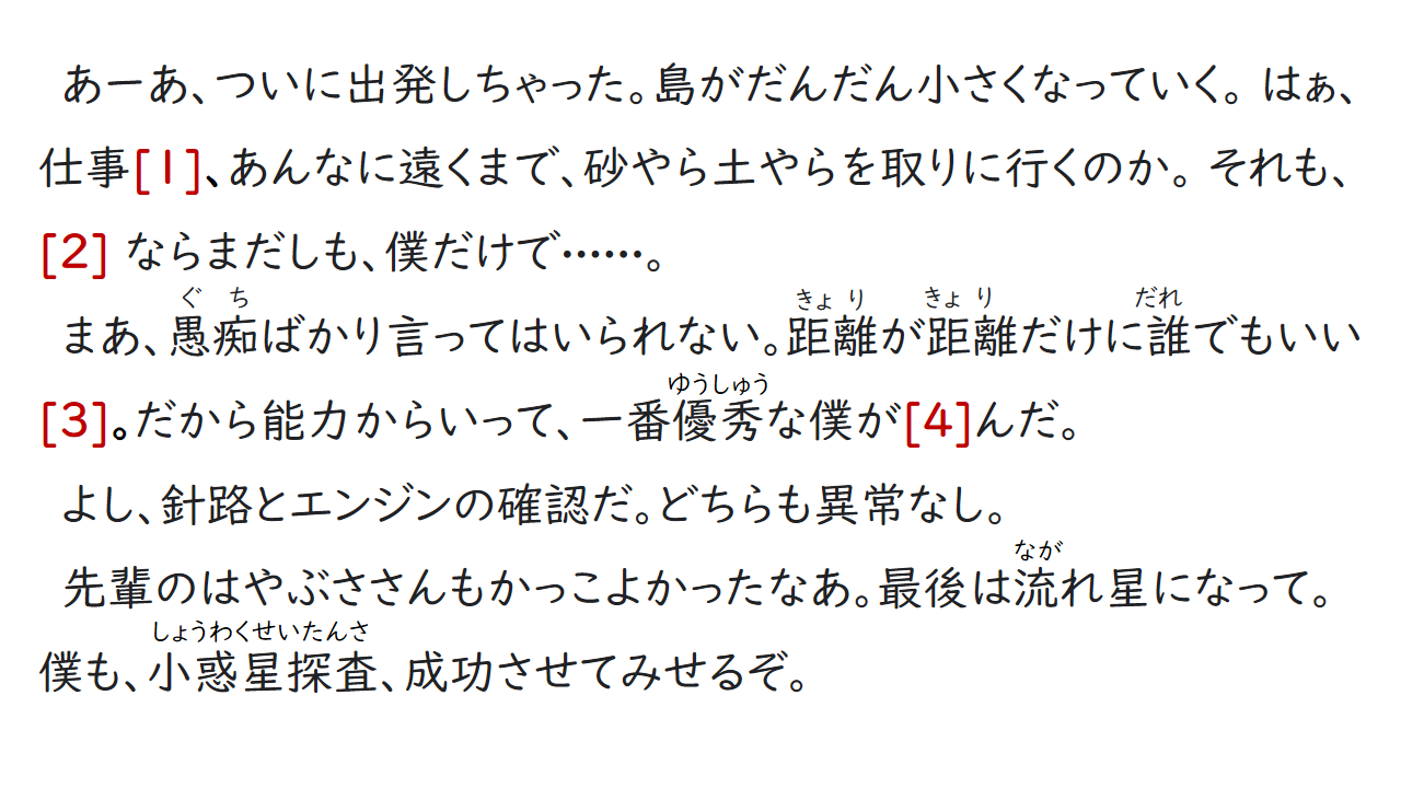 あーあ、ついに出発しちゃった。島がだんだん小さくなっていく。 はぁ、仕事[1]、あんなに遠くまで、砂やら土やらを取りに行くのか。 それも、[2] ならまだしも、僕だけで······。