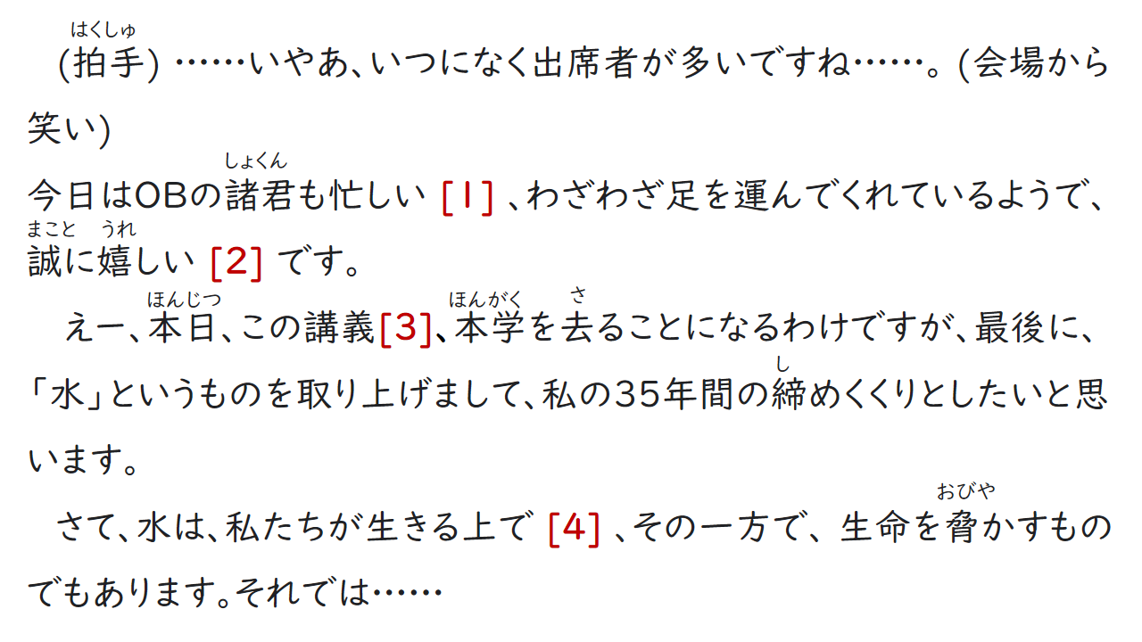 えー、本日、この講義[3]、本学を去ることになるわけですが、最後に、「水」というものを取り上げまして、私の35年間の締めくくりとしたいと思います。
