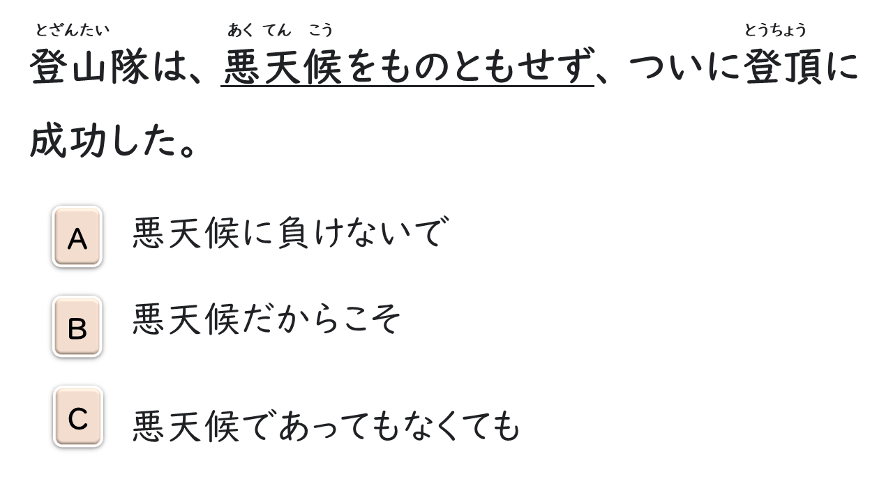 | あくてんこう | 悪天候 | ÁC THIÊN HẬU | Thời tiết khắc nghiệt |