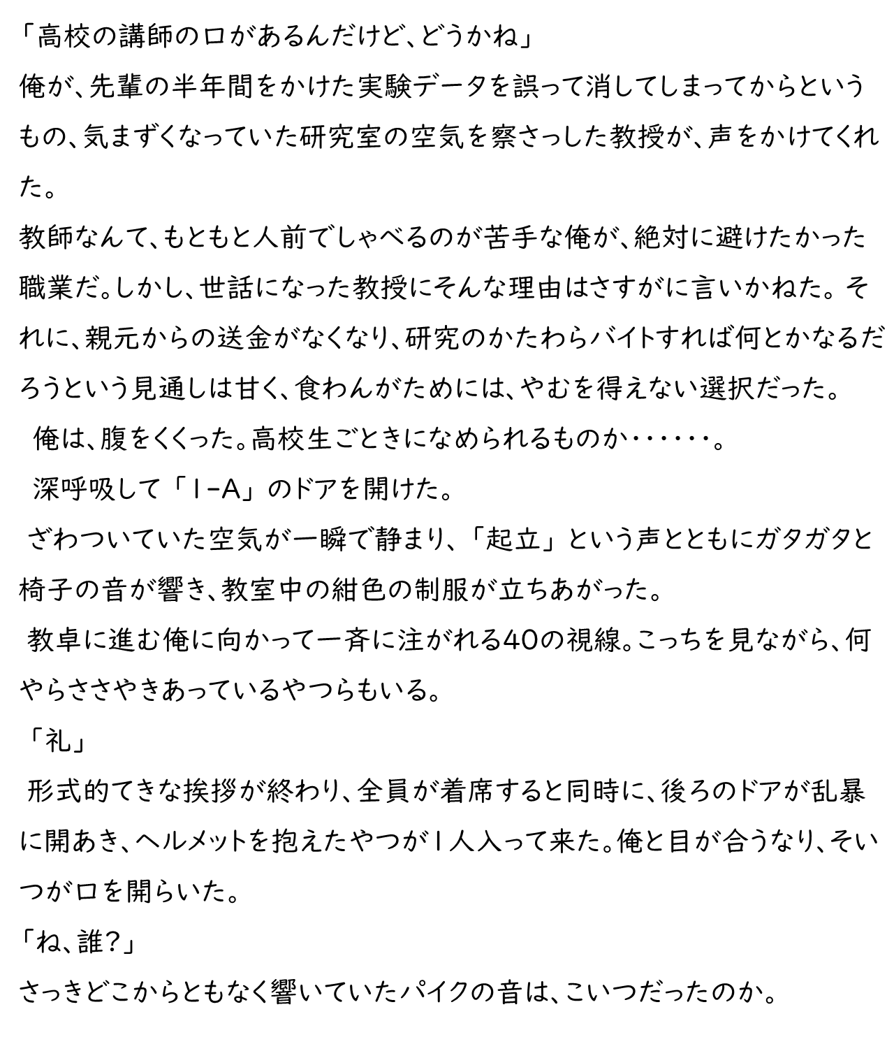 教師なんて、もともと人前でしゃべるのが苦手な俺が、絶対に避けたかった職業だ。しかし、世話になった教授にそんな理由はさすがに言いかねた。 それに、親元からの送金がなくなり、研究のかたわらバイトすれば何とかなるだろうという見通しは甘く、食わんがためには、やむを得ない選択だった。