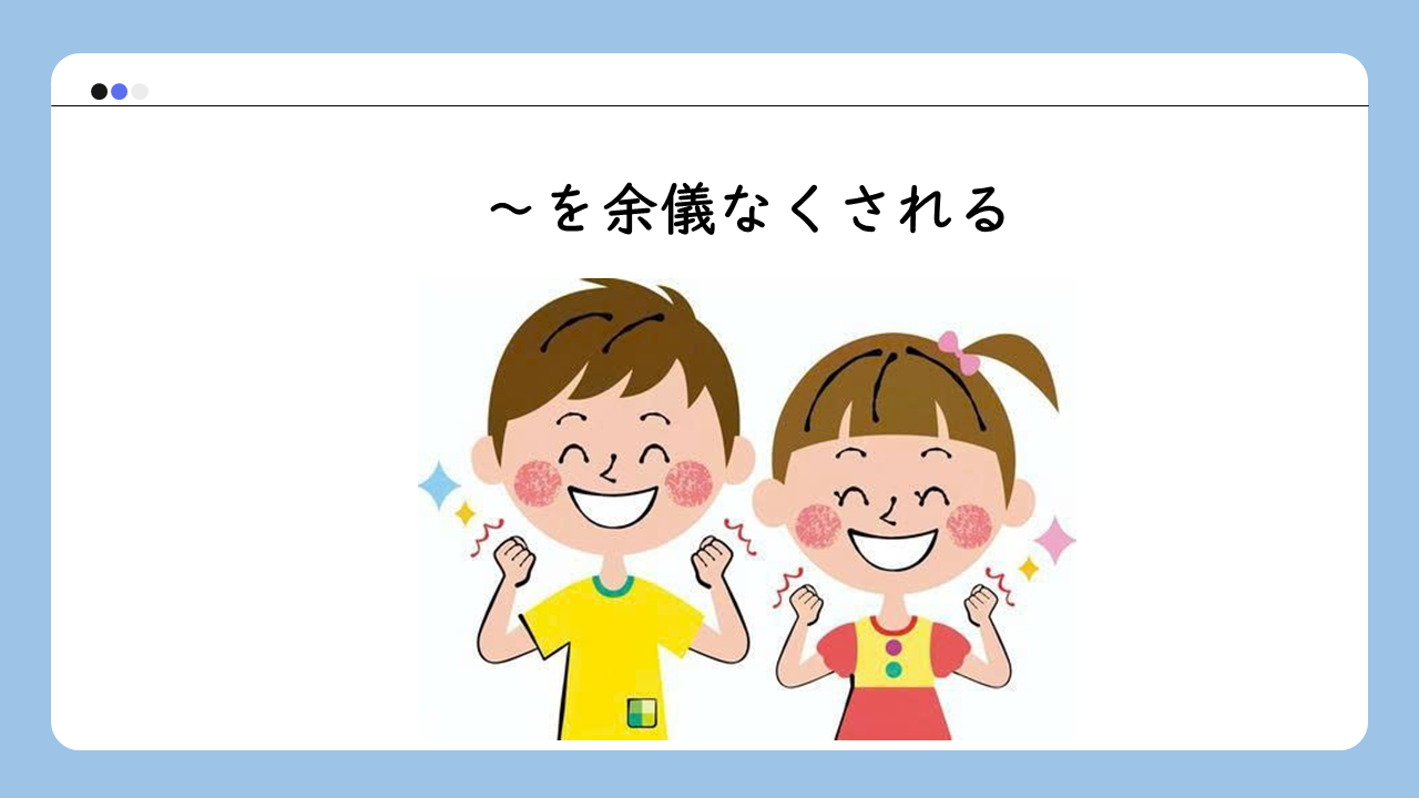 ~を余儀なくさせる được sử dụng khi muốn nói rằng “mình bị dồn vào tình trạng đành phải làm ~ cho dù có gì đó không thích đi nữa”.