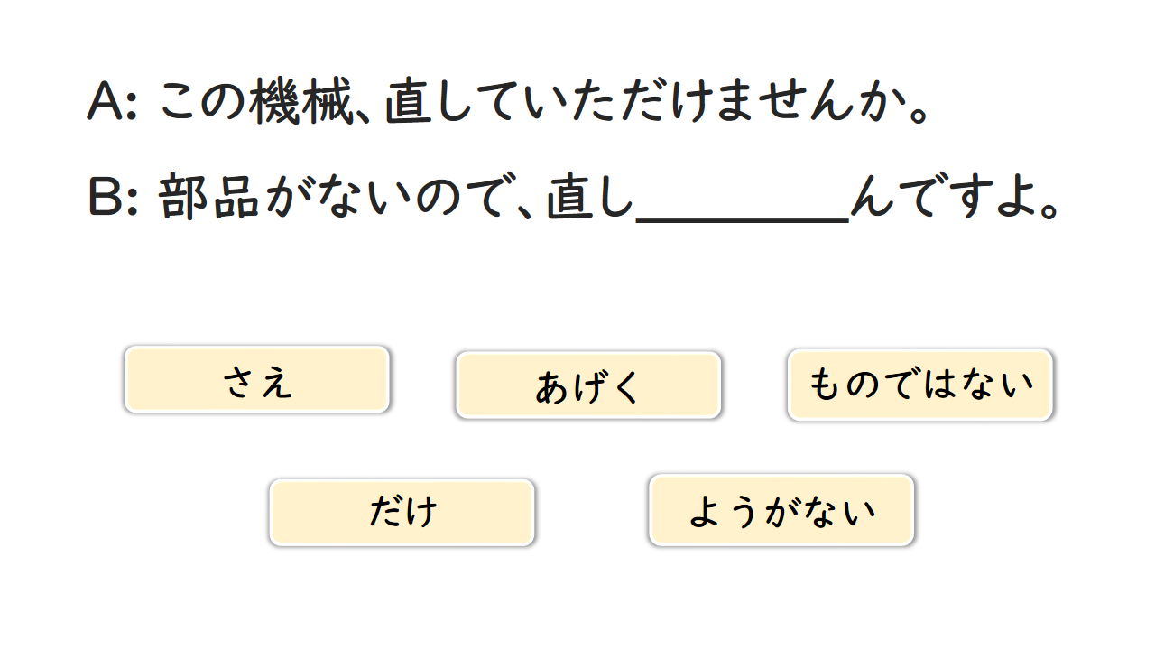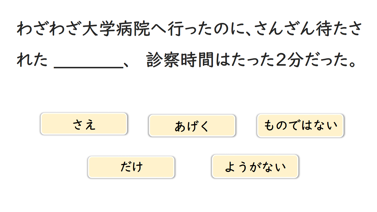 Nếu thuận tiện cho anh/chị, ngày mai tôi sẽ đến gặp. V Tôi muốn xin việc ở công ty Takeda Sangyo, nhưng vì họ không tuyển dụng sinh viên mới tốt nghiệp nên tôi cũng đành chịu. Vた+あげく(に) Vị khách lúc nãy, sau khi thử hết món này đến món kia, cuối cùng lại chẳng mua gì cả rồi bỏ về... Vる+ものではない/もんじゃない Không nên nói xấu người khác. Vる+だけ+V Bây giờ đi có thể sẽ không kịp, nhưng cứ thử đi xem sao.