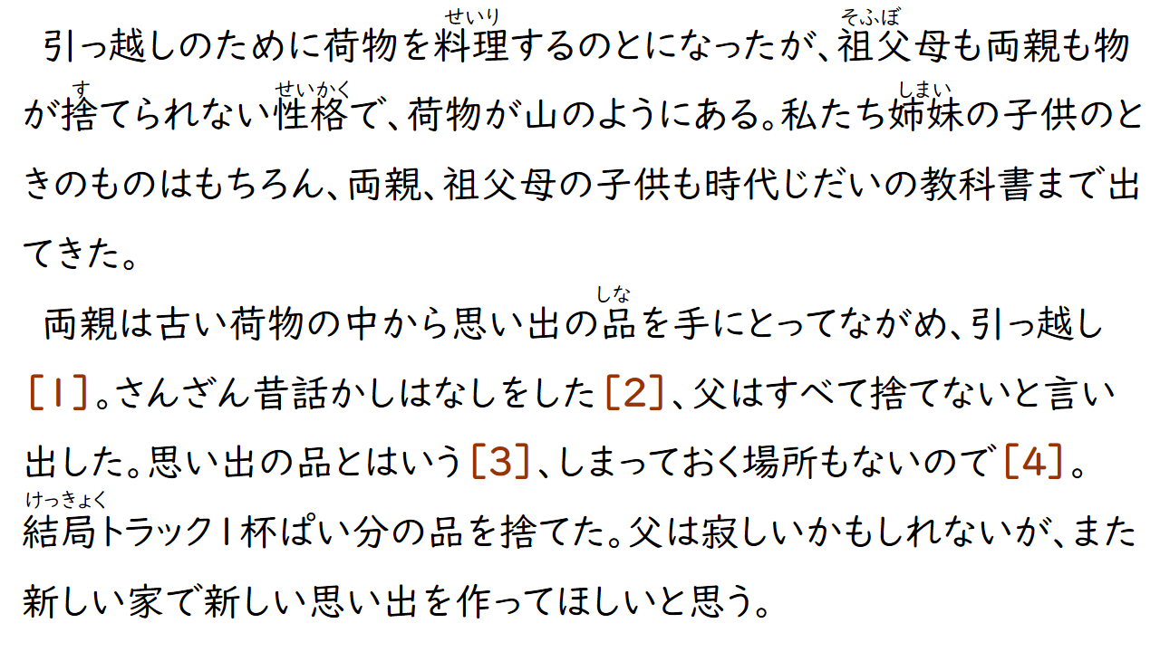 両親は古い荷物の中から思い出のしなを手にとってながめ、引っ越し[1]。さんざん昔話むかしはなしをした[2]、父はすべて捨てないと言い出した。思い出の品とはいう[3]、しまっておく場所もないので[4]結局けっきょくトラック1ぱい分の品を捨てた。父は寂しいかもしれないが、また新しい家で新しい思い出を作ってほしいと思う。