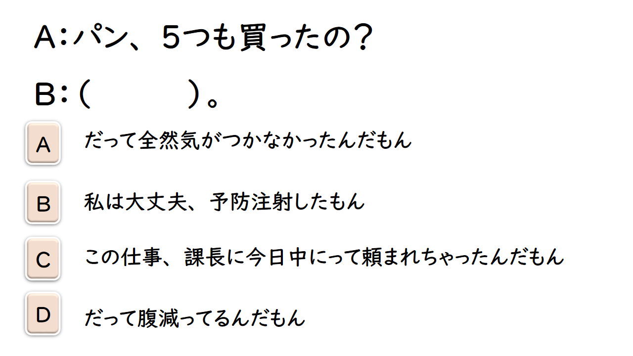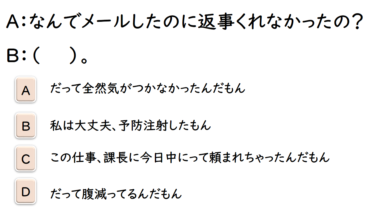 理由の説明や言い訳を言うときに使う。「もの」は主に女性が使う言葉。