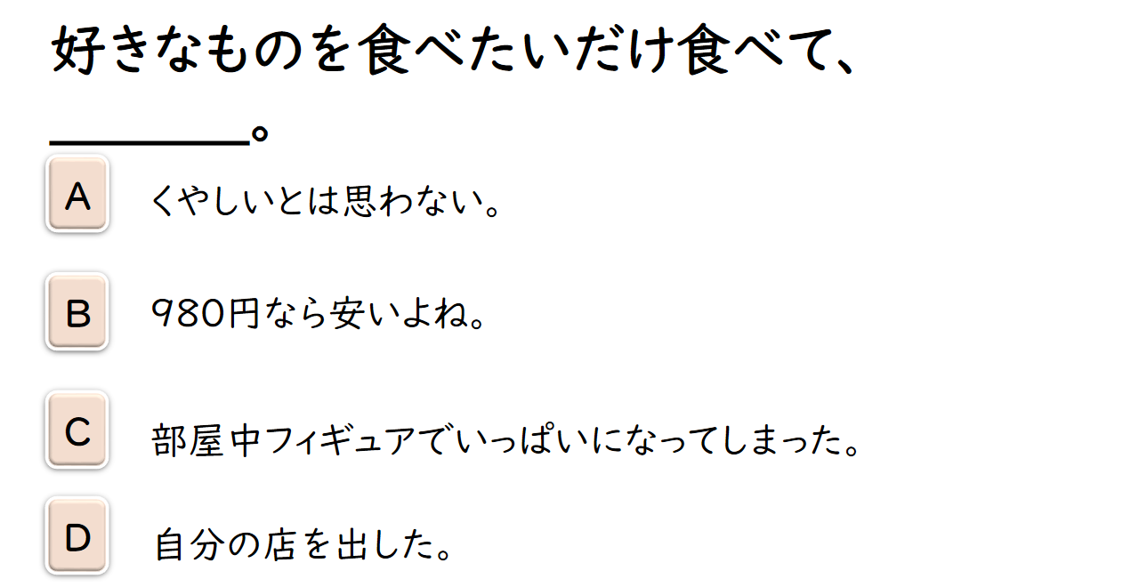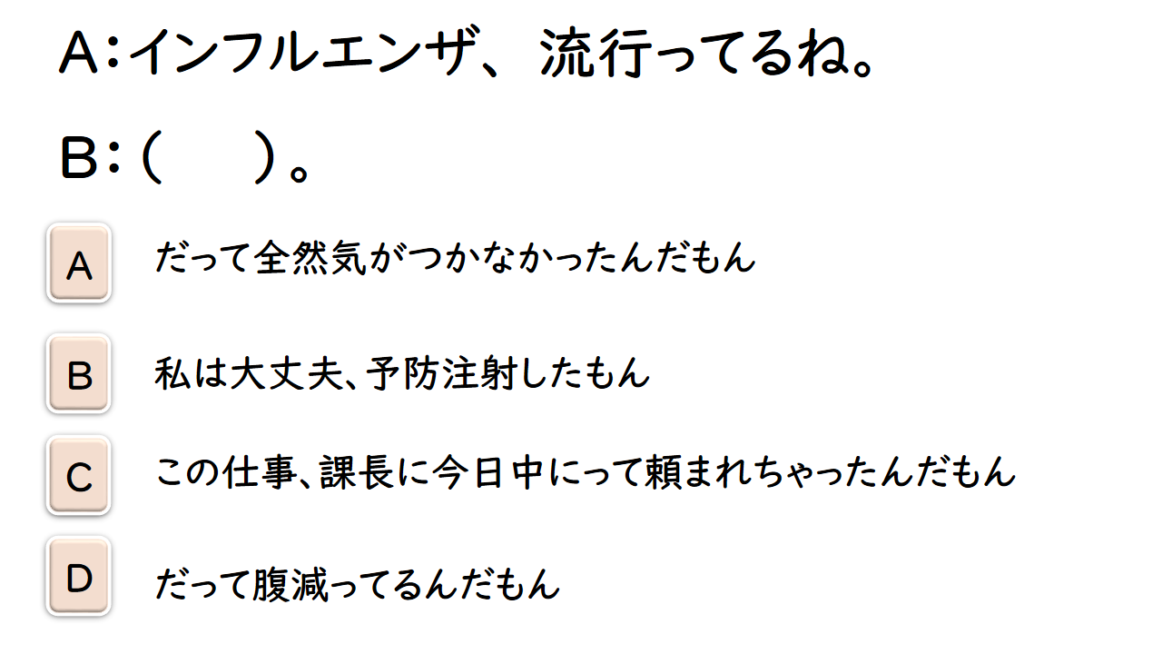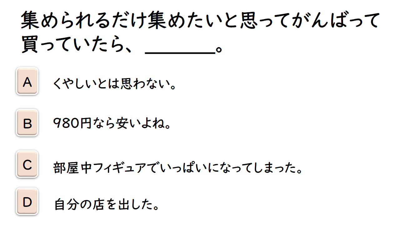 B:だって、この人形もこのお菓子も日本じゃなきゃ、買えないんだもん。