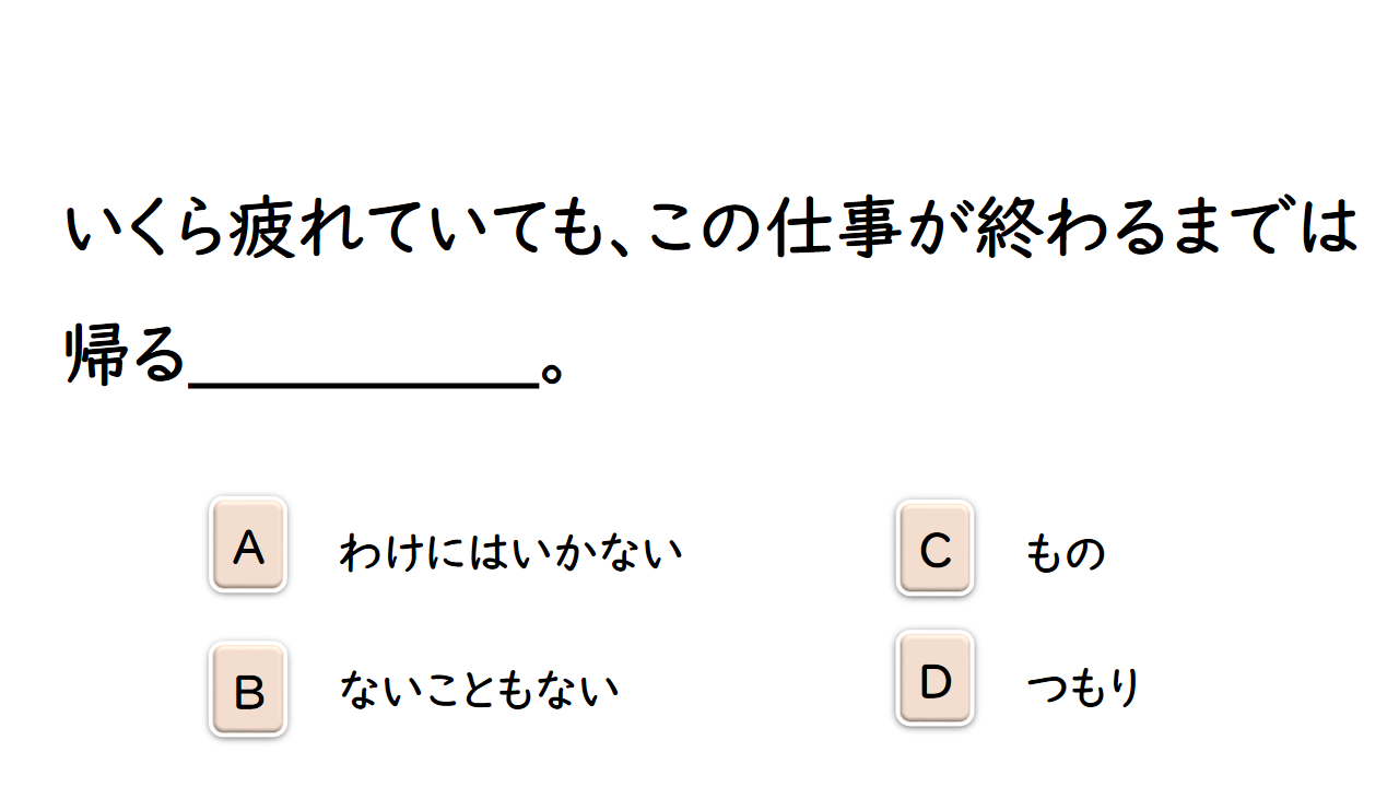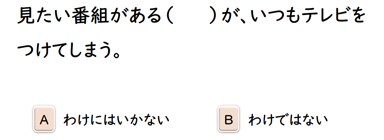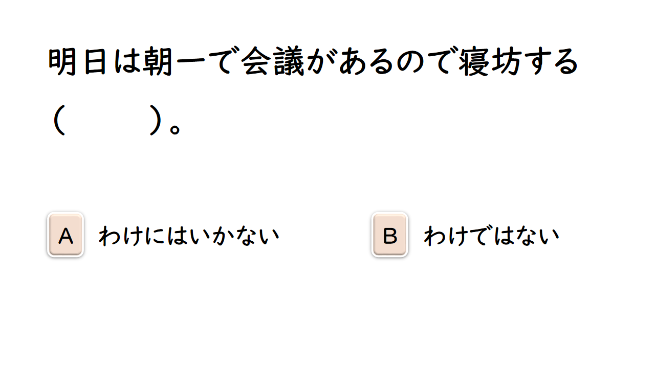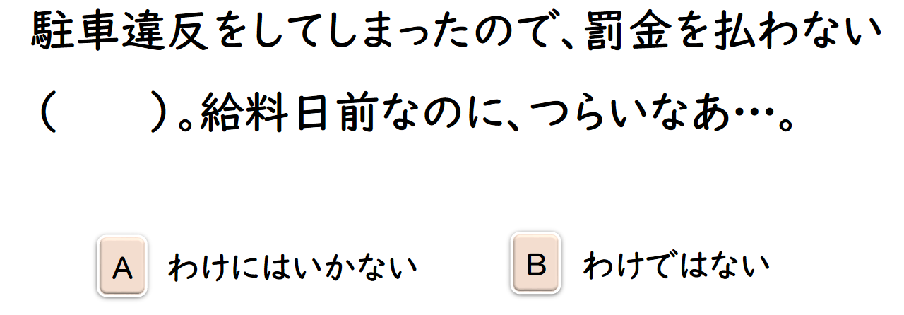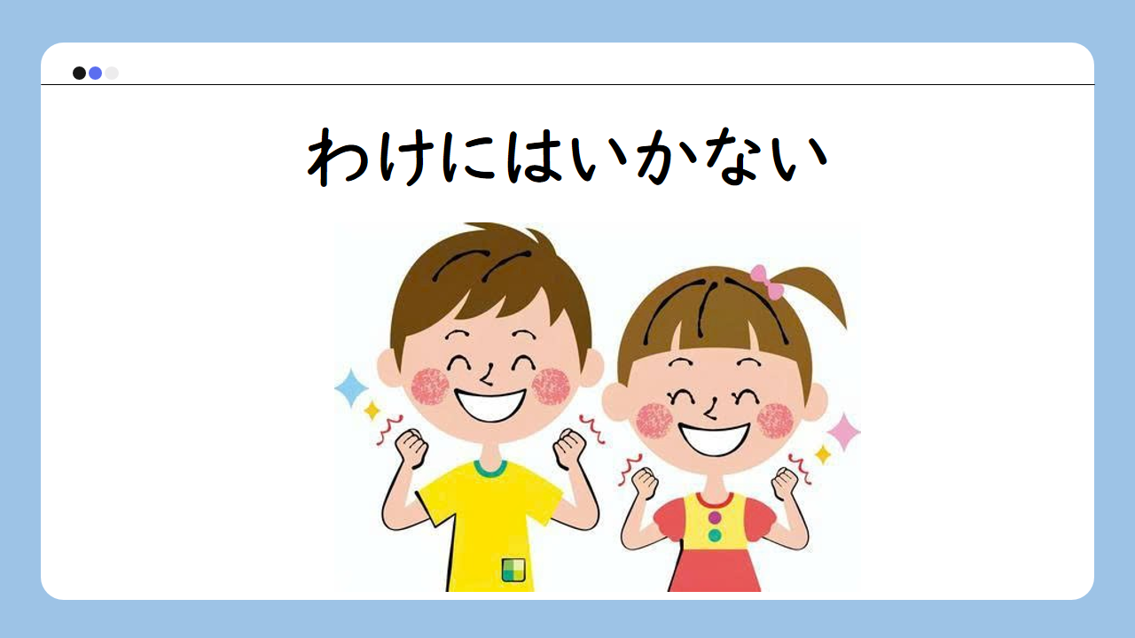 「休むわけにはいかない」のように、「理由があってできない」と言いたいときに使う。また、「働かないわけにはいかない」のように、「しなければならない」と言いたいときにも使う。