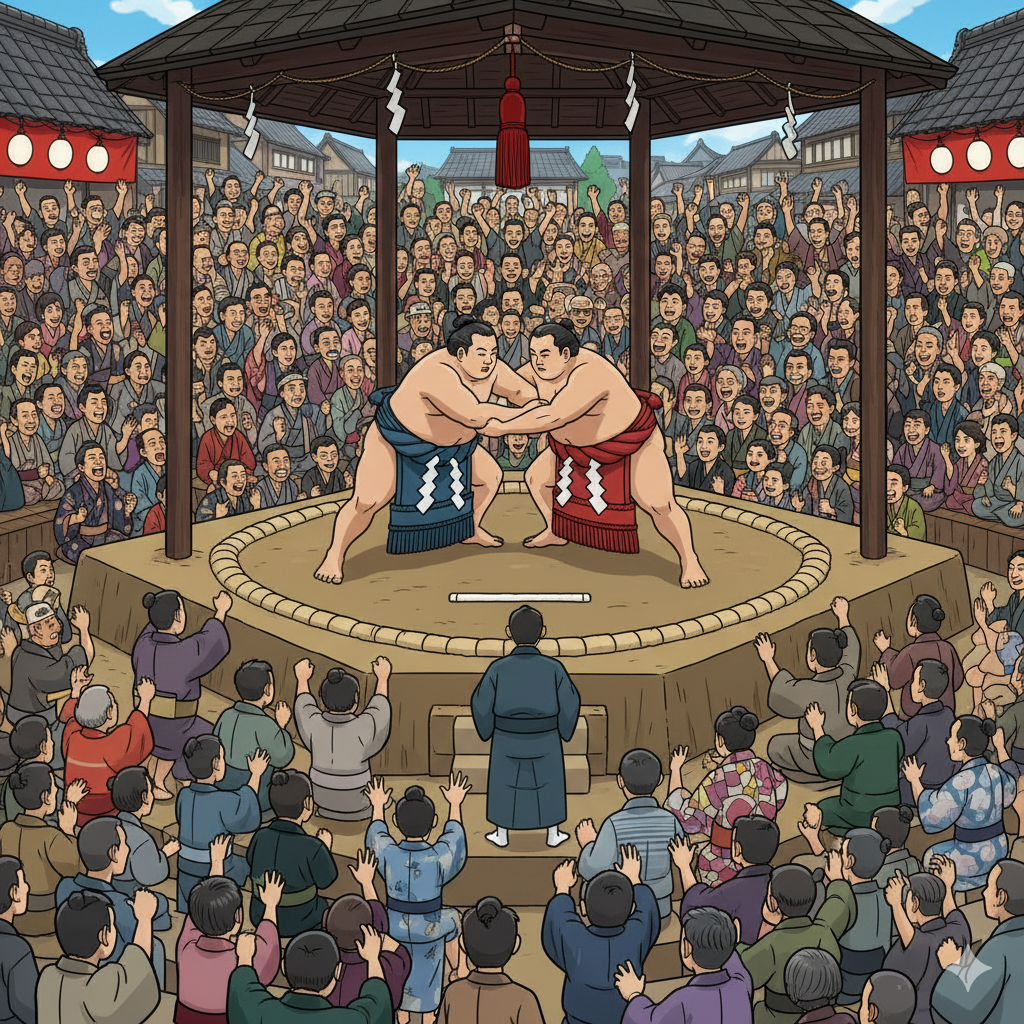 江戸時代に相撲はプロ・スポーツになりました。毎年 2回 たくさんの人が相撲を見に行きました。みんなゆっくり相撲を見ました。ごはんを食べたり、お茶を飲んだりしても よかったです。有名な力士は落語や歌舞伎の主人公になりました。