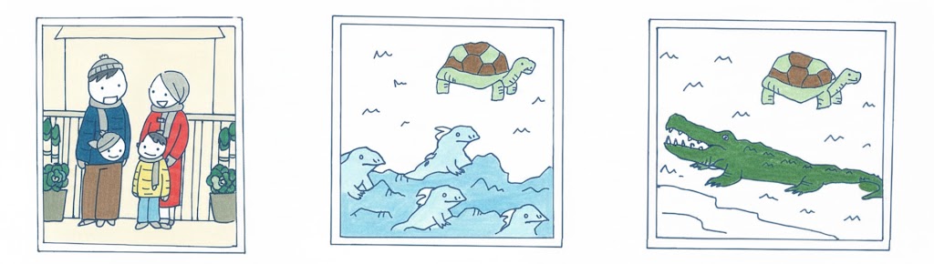 この間、隣の家のペットがうちへ入ってきて、びっくりしました。 とても大きいカメだったので、子どもたちが泣いて、騒いで、大変でした。