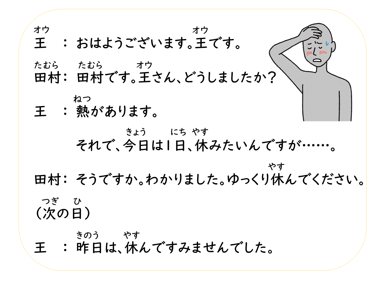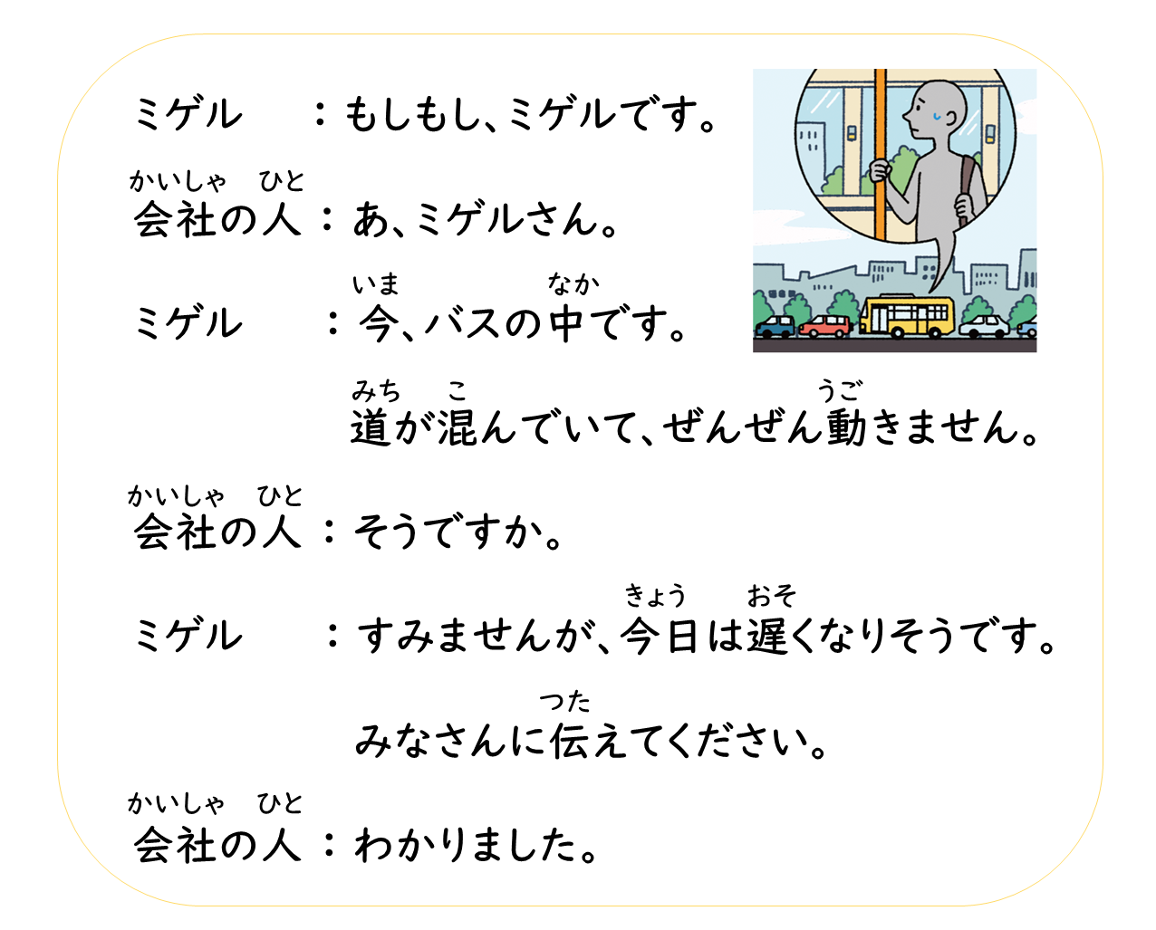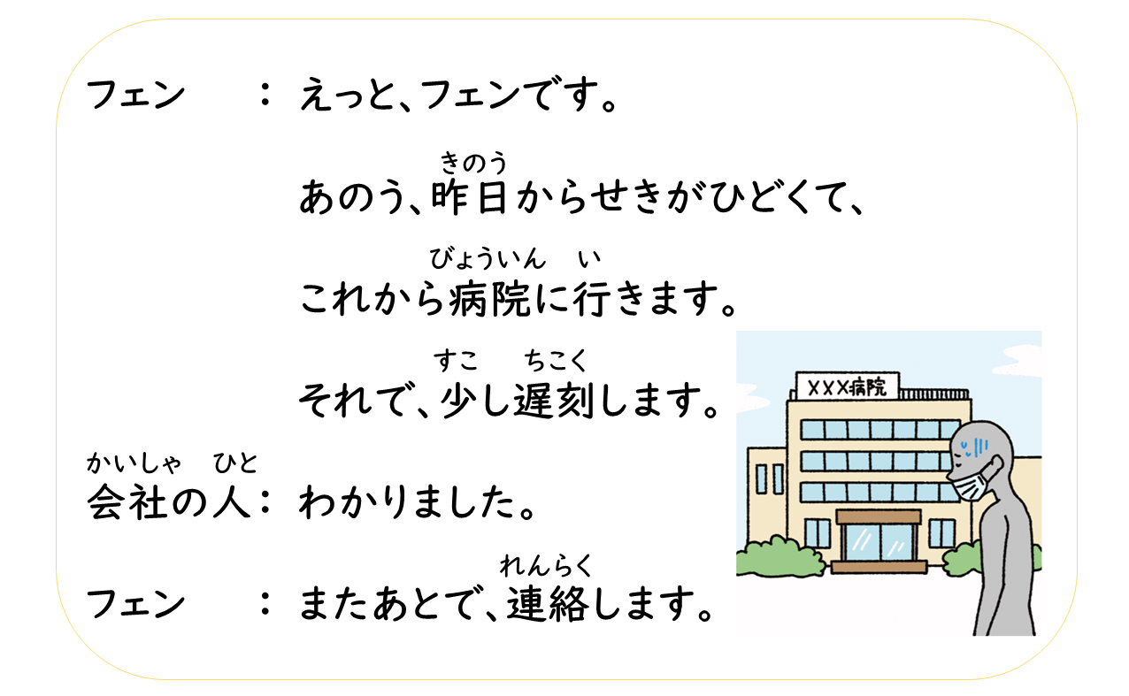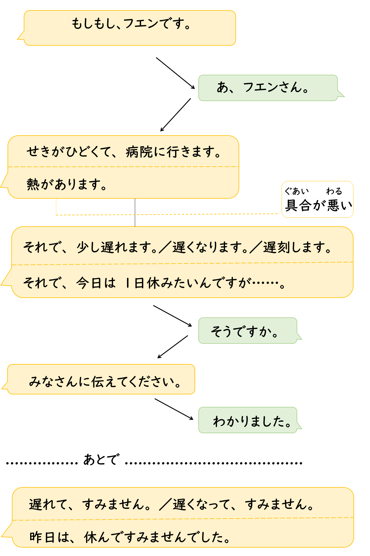1人が遅刻や休みの理由を考えて、職場に電話しましょう。もう1人は、電話を受けましょう。