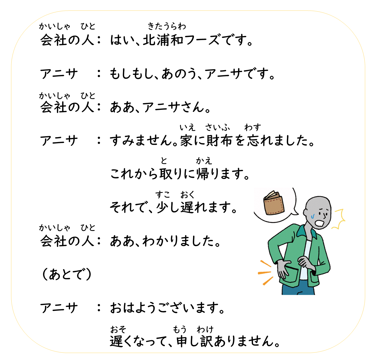 1人が遅刻や休みの理由を考えて、職場に電話しましょう。もう1人は、電話を受けましょう。