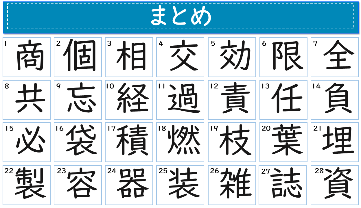 N2・第10課 ÔN TẬP KANJI N2.10 1 / 16 練習1: 正しいほうに○をつけ、文の漢字にひらがなで読みを書きなさい。 1.この楽は風邪によく( _ )。 a. 効く b. 聞く 2 / 16 2.外国の人たちと( _ )するのは楽しいです。 a. 交流 b. 交換 3 / 16 3.今までに一度も負けたことのない( _ )に負けてしまった。 a. 相手 b. 相当 4 / 16 4.卵10個入りバック百円!お一人様1パック( _ )! a. 参り b. 限り 5 / 16 5.子どもの勉強のことは( _ )の先生にお任せしています。 a. 担任 b. 責任 6 / 16 6.この薬を飲んでください。1週間( _ )をみましょう。 a. 経験 b. 経過 7 / 16 7.仕事の量が多過ぎる。社員の( _ )を軽くしなければならない。 a. 負担 b. 担当 8 / 16 8.このカードは全店( _ )でお使いになれます。 a. 共通 b. 通過 9 / 16 練習2: 正しいほうに○をつけ、文の漢字にひらがなで読みを書きなさい。 9.雪が( _ )花だんが埋まってしまった。 a. 保って b. 積もっと 10 / 16 10.落ち葉や木の枝は( _ )ゴミになります。 a. 燃やせる b. 埋め立て 11 / 16 11.この洗剤を使うときは必ずゴム( _ )をしてください。 a. 手袋 b. 足袋 12 / 16 12.植物から自動車の( _ )を作る。 a. 原料 b. 燃料 13 / 16 13.( _ )がきれいだと、料理もおいしく見える。 a. 衣 b. 器 14 / 16 14.この時計はスイス( _ )です。 a. 製 b. 作 15 / 16 15.( _ )がひどくて電話がよく聞こえません。 a. 雑用 b. 雑音 16 / 16 16.この町ではリサイクルのため、第2土曜日に古新聞・古雑誌などを( _ )します。 a. 回収 b. 包装 Your score isThe average score is 0%