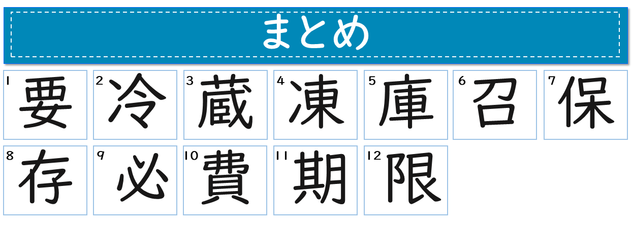 要 必要 要る 重要 冷 冷房 冷たい 冷やす 冷える 冷める 冷ます 蔵 凍 冷凍庫 凍る 庫 金庫 車庫 召 召し上がる 保 保存する 存 ご存じです 存じません 必 必要 必死 必ず 費 費用 消費者 旅費 会費 期 期間 定期券 長期 短期 限 期限 限度 限る 限定