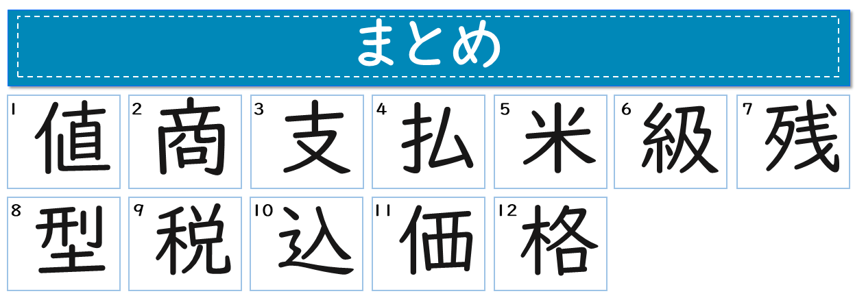 値 値段 値上げ 値下げ 商 商品 商店 支 支店 本店 支社 本社 払 払う 支払い 米 米国 米 級 高級 中級 上級 残 残業 残り 残る 残す 型 型 大型 小型 新型 税 消費税 税金 込 込む 振り込む 税込 価 価格 定価 格 合格 格安