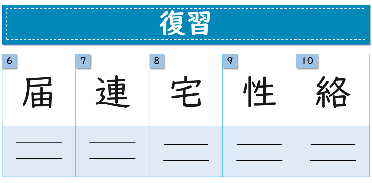 申 申し込む 申込書 申告 申請 申す 申し上げる 記 記入 日記 記号 記事 例 例 例えば 齢 年齢 高齢 〜歳 二十歳 性 性別 性格 女性 男性 連 連休 連れて行く 連れて来る 絡 連絡 届 届ける 届く 宅 自宅 お宅 宅配 配 配達 配送料 心配 配る 希 希望