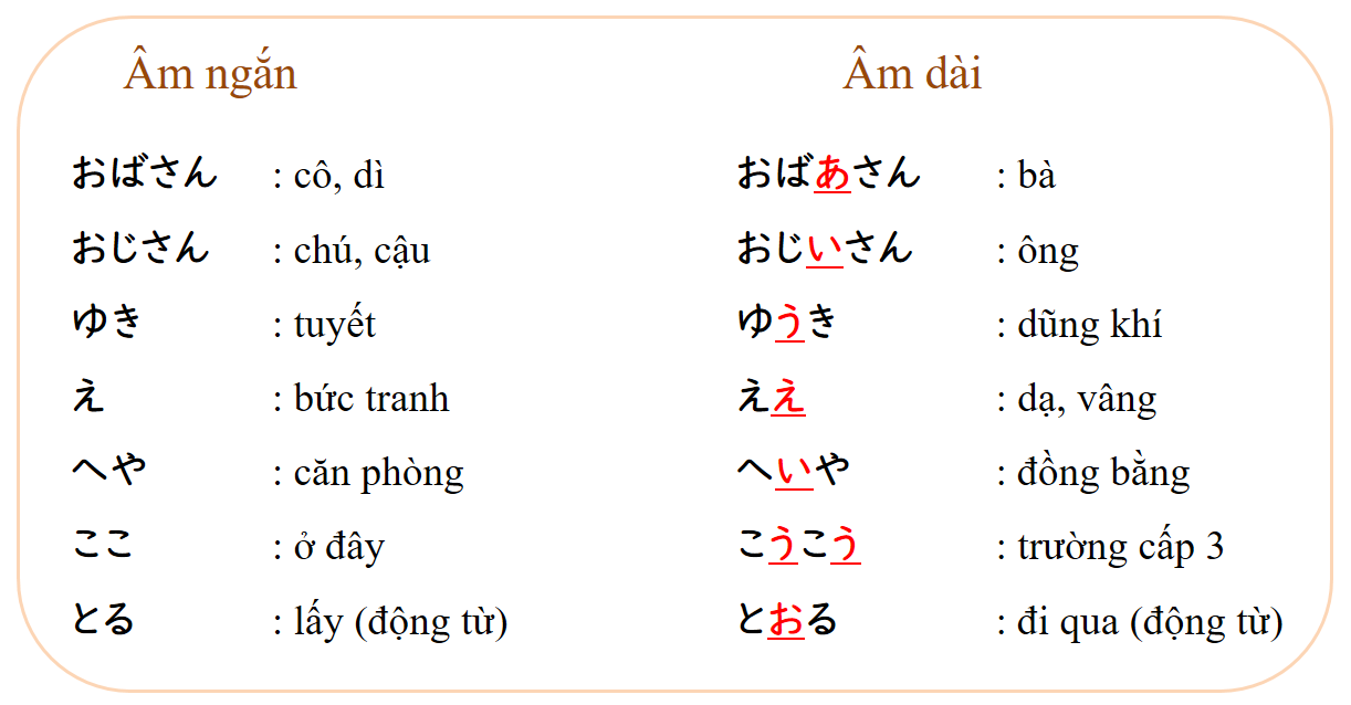 - Âm ngắn trong tiếng Nhật là năm âm あ、い、う、え、お và những nguyên âm này khi phát âm kéo dài thì gọi là âm dài.