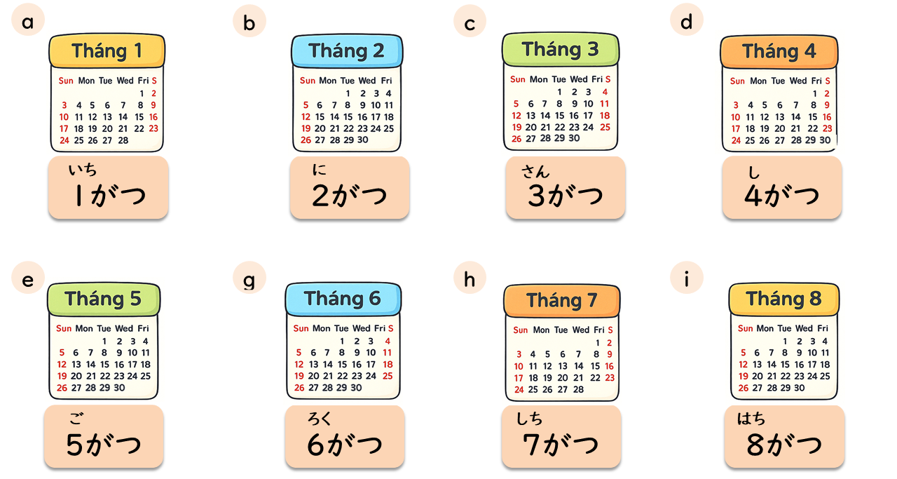 にがつ ろくがつ しがつ はちがつ じゅうにがつ さんがつ しちがつ じゅういちがつ いちがつ ごがつ くがつ じゅうがつ Buổi giao lưu Kỳ nghỉ tết Dã ngoại Ngày nhà giáo Hội thi thể thao Ngày lễ thiếu nhi Kiểm tra Kỳ nghỉ hè テスト こどものひ えんそく こうりゅうかい うんどうかい テトやすみ せんせいのひ なつやすみ